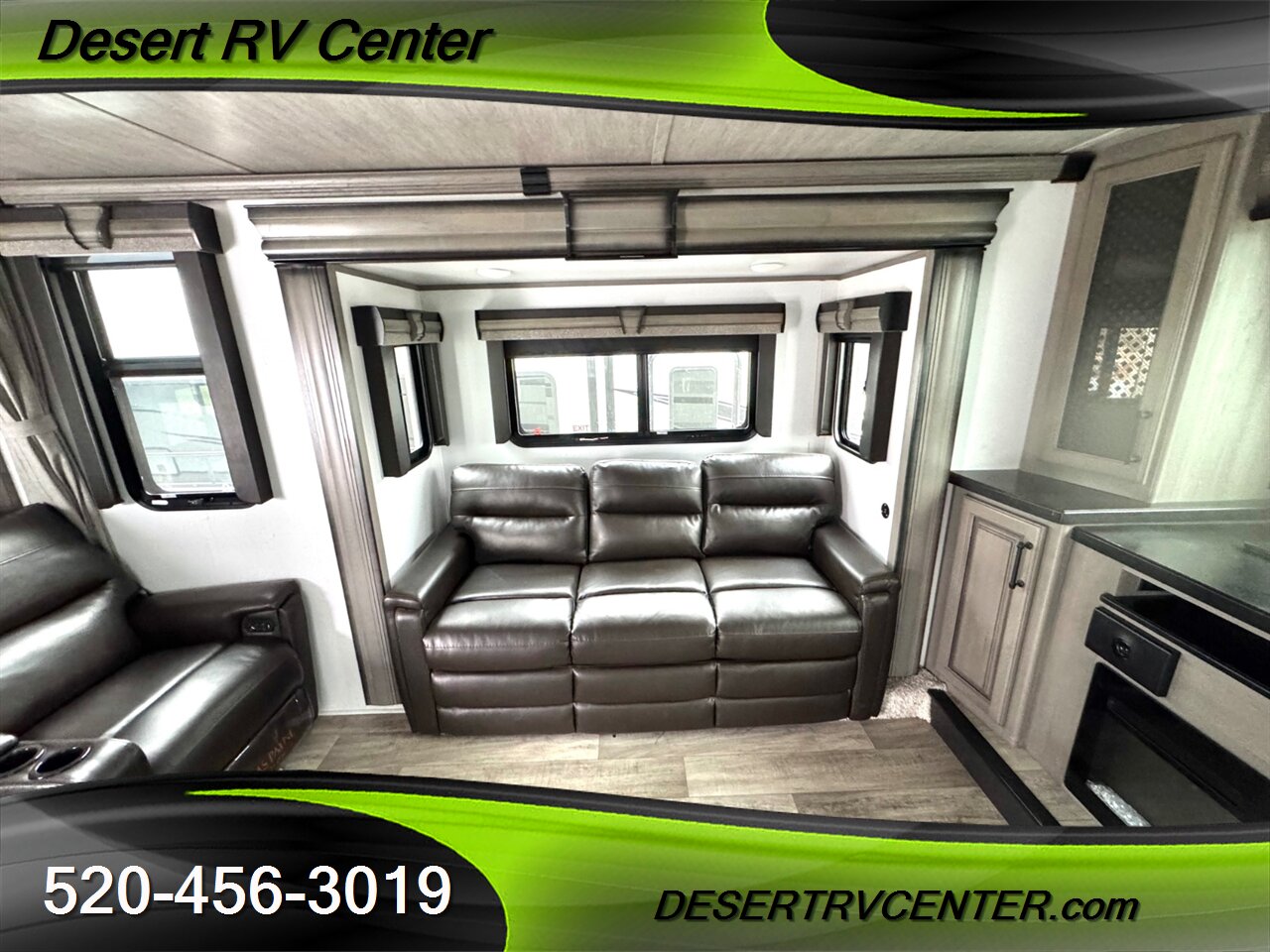 Front Living Area: Features opposing sofa beds, theater seating, a fireplace, and a pop-up TV